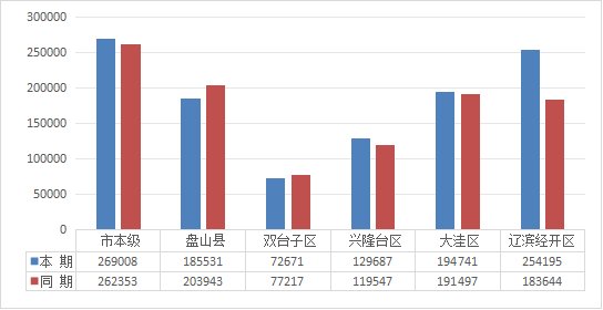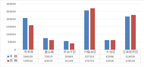 其中:盘山县7.5亿元,同比增长19.0%,为预算的54.0%;双台子区5.6亿元,同比增长36.0%,为预算的69.9%;兴隆台区25.7亿元,同比下降5.0%,为预算的47.2%;大洼区6.3亿元,同比增长0.5%,为预算的52.3%;辽滨经开区21.7亿元,同比下降4.9%,为预算的61.6%。