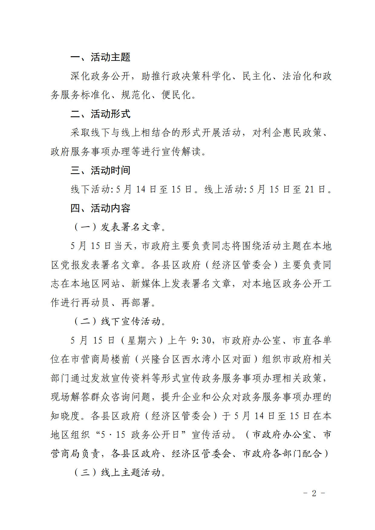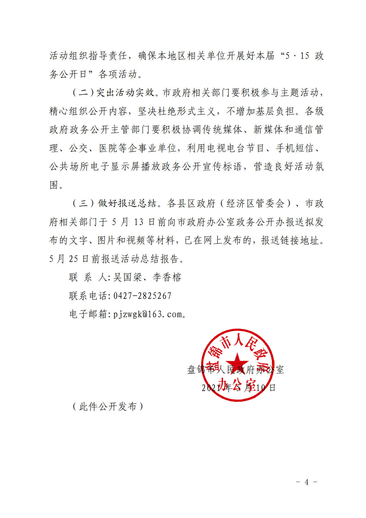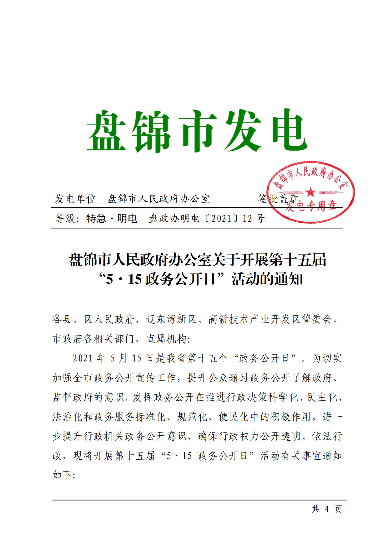 盘政办明电〔2021〕12号 盘锦市人民政府办公室关于开展第十五届“5•15政务公开日”活动的通知